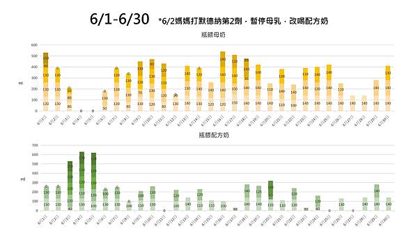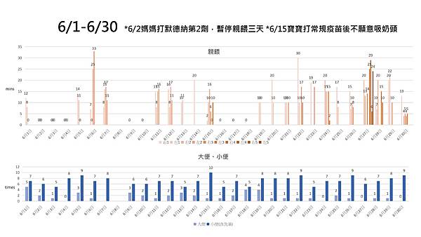 ■ 由於乳頭還在適應寶寶的強大的吸吮力,所以前期不是每天親餵,怕再次破皮。親餵用橘色代表,Y軸代表分鐘(min),X軸有分右1左1右2左2...,以6/6來說,表示那天第一次親餵給寶寶吸吮右邊乳頭7分鐘,左邊乳頭休息;第二次親餵右邊乳頭吸了25分鐘,左邊乳頭吸33分鐘,以此類推。6月中下旬開始增加親餵次數,但是6/15寶寶打完預防針後突然不願意吸乳頭,嘴巴碰到乳頭就推開,不太清楚是什麼原因,看了很多文章和其他媽媽的經驗,嘗試了很多方式也沒用。我只能用乳頭保護罩做輔助,不強迫吸吮,還是每天讓她跟乳頭接觸。過程中我偷偷大哭過,覺得家人都不支持我親餵,寶寶又不配合,結果,6/27寶寶突然就願意吸了! 直到現在我依然不理解是什麼原因,可能是寶寶不想讓媽媽再傷心了吧?! 所以這個問題就自然而然解決了><