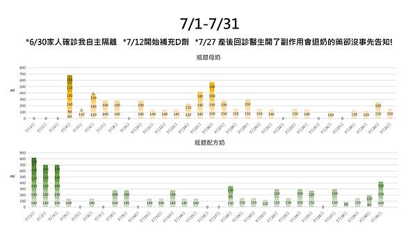 ■ 6月開始資料就記錄的很詳細了,黃色表示瓶餵母奶,綠色代表瓶餵配方奶,Y軸代表奶量(ml),X軸是日期,每一格代表每一餐喝的奶量。這個月寶寶主要喝母奶,一天只有一至二餐配方奶,醫生說這樣的混哺次數很健康,而且按照寶寶的身高體重,我的母乳很營養。這段期間我沒吃中藥的水藥來發奶,婆婆煮飯常會加入豬腳,不過似乎對我沒太大作用。