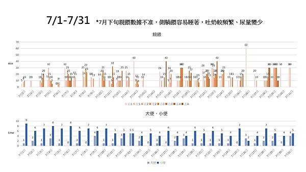 ■ 7月瓶餵母奶和瓶餵配方奶的次數雙雙下降,因為親餵的次數提高了。親餵次數多更要觀察小便次數,可以發現7月中下旬開始,寶寶的小便次數開始降低,尤其是7/26過後,代表寶寶喝進去的奶可能沒那麼多。這邊又是另一個血淚故事: 我7月底產後回診,醫生發現我有多囊性卵巢,所以開了藥回去讓我吃。當時他沒有問我有沒有在哺餵母乳,也沒有告訴我藥物副作用會退奶,我一直很信任醫生,想說他是幫我接生的醫生,我的狀況他電腦都有紀錄,所以一直也沒多問什麼,結果回去藥吃完了才發現自己奶量驟減,但已經來不及了。因此,這邊要提醒各位媽咪,寧可讓醫生覺得你很煩,也不要過度相信醫生。雖然我已經盡量不找名醫了,但現在婦產科醫生越來越少,且願意接生的婦產科醫生也在遞減,病人卻沒有減少,醫生每天都要在下班前消化完所有掛號的病人,自然會壓縮每一個病患問診的時間,就不會那麼仔細,所以我們只能自己小心,多問多看多聽。