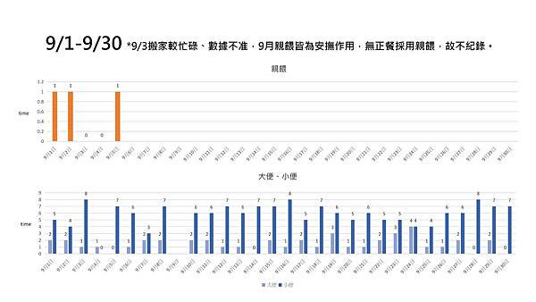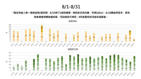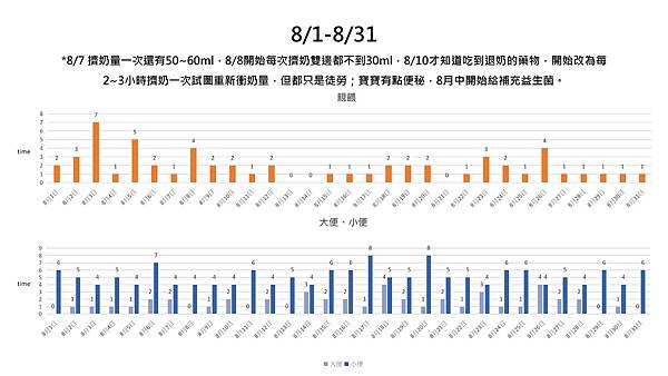 ■ 8月由於母奶量驟減,因此只能以配方奶為主,一餐最多160ml,親餵的紀錄也改為用次數來記錄,可以很明顯的發現,芋園喝的配方奶越多,小便次數就越正常。