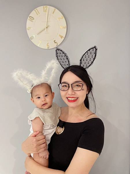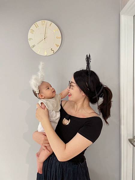 ▪ 寶寶穿白色衣服戴白色兔子髮箍,我穿黑衣黑裙戴黑色兔子髮箍,我還在臉上用黑色眼線筆畫上小蜘蛛和蝙蝠,等女鵝大一點我再來畫恐怖妝好了XD 可能是髮箍戴著不舒服,寶寶不賞臉,5-10分鐘就想掙脫束縛。 照片中的我大概是70公斤,產後很少拍照,因為胖到不能見人,所以這算是產後為數不多的照片,頭髮還凌亂到不行,就知道當天有多忙碌,要幫寶寶打扮、布置場景,還要煮飯化妝,我真是太難了!