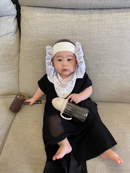 去年十月在家閒來無事,想說趁寶寶還算好控制的時候跟她一起玩造型,於是開始找身邊可廢物利用的東西,拼拼湊湊就把女鵝打扮成法官了,只在萬聖節開庭,超可愛!
